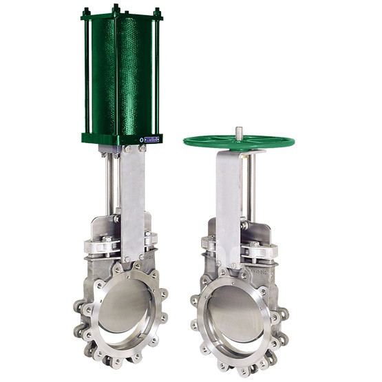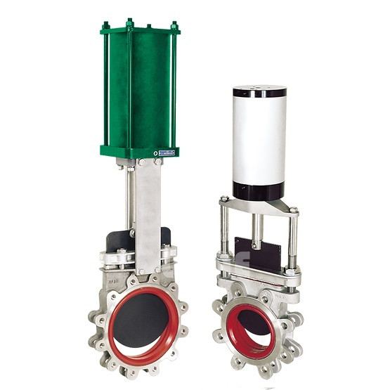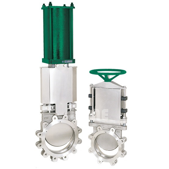 美国《LAINE》莱恩进口气动刀闸阀(Pneumatic knife gate valve)启闭件为闸板,闸板的运动方向与流体方向相垂直,随着闸板的升降从而达到开关的目的,闸板有两个密封面,较常用的楔式闸板阀的两个密封面形成楔形,闸阀关闭时,密封面可以只依靠介质压力来密封,即依靠介质压力将闸板的密封面压向另一侧的阀座来保证密封面的密封,大部分闸阀是采用强制密封的,即阀门关闭时,要依靠外力强行将闸板压向阀座,以保证密封面的密封性。